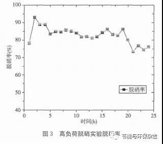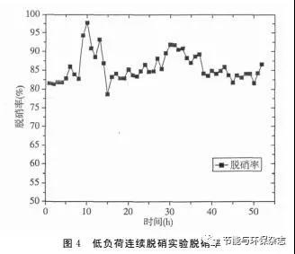 中試期間,由于焦化廠部分工段檢修,焦?fàn)t進(jìn)入低負(fù)荷運(yùn)行狀態(tài),尾氣中NOx濃度均值約500mg/Nm3,故對低負(fù)荷的煉焦尾氣進(jìn)行連續(xù)脫硝中試。中試條件:進(jìn)入脫硝中試裝置的煙氣流量55m3/h左右,催化劑層溫度150℃,進(jìn)入系統(tǒng)的氨氣的流量0.2L/min。圖4為低負(fù)荷連續(xù)脫硝實驗脫硝率圖,圖示連續(xù)脫硝實驗運(yùn)行時間為52小時。脫硝率在78%~98%范圍內(nèi),運(yùn)行期間催化劑活性未出現(xiàn)減弱趨勢,實驗結(jié)果顯示選用的低溫催化劑可用于焦化煙氣的連續(xù)脫硝,并維持高的脫硝率。