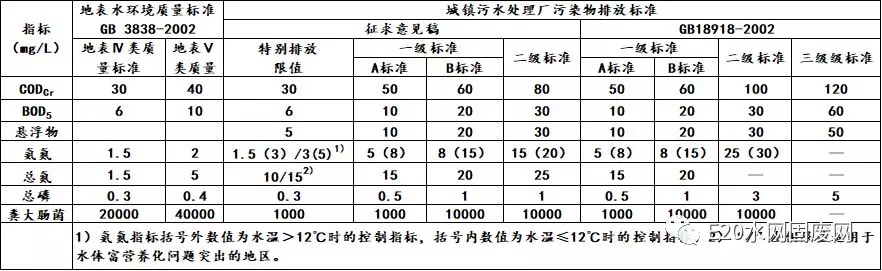 越來越常見的“Ⅳ類水”,指的是《地表水環(huán)境質(zhì)量標(biāo)準(zhǔn)》中地表四類水。而《城鎮(zhèn)污水處理廠污染物排放標(biāo)準(zhǔn)》(征求意見稿)中的特別排放限值,由于除總氮一項(xiàng)指標(biāo)外,其余均與地表Ⅳ類水相同,故其又被稱為“準(zhǔn)Ⅳ類水”標(biāo)準(zhǔn)。二者與“一級A”標(biāo)準(zhǔn)的主要指標(biāo)數(shù)值對比如下:
