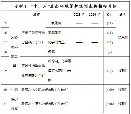 ——污染物排放總量控制目標。到2020年,全區(qū)化學(xué)需氧量、氨氮、二氧化硫和氮氧化物排放總量分別控制在77.66萬噸、4.37萬噸、109.56萬噸和101.37萬噸以內(nèi),比2015年的83.56萬噸、4.69萬噸、123.09萬噸和113.88萬噸分別減少7.1%、7%、11%和11%。呼倫湖、烏梁素海匯水范圍內(nèi)總氮減少10%。