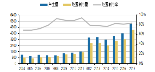 據(jù)國家統(tǒng)計局數(shù)據(jù)顯示,2017年我國危險廢物產(chǎn)生量5340萬噸,較去年增長34.49%。其中綜合利用2800萬噸,處置1600萬噸,綜合處置利用率高達83%。