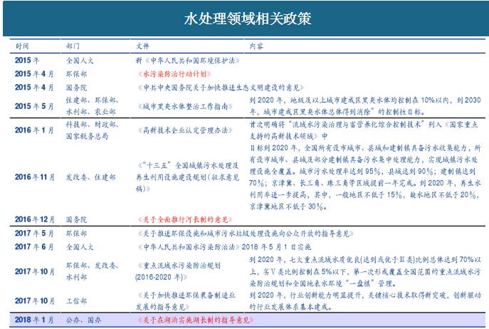 (簡稱水十條)。而在2016年“河長制”正式頒布,從水治理體制層面實現(xiàn)創(chuàng)新,明確了地方主體責任和河湖管理保護各項任務;2017年水治理領域個細分領域細則逐步出臺,對于污水治理、黑臭水體、海綿城市等細分領域提出具體要求,水治理開始走向綜合化和混合型;2018年開年出臺“湖長制”,“河湖雙治”全國一盤棋有望在2018年實現(xiàn),國家對湖泊生態(tài)環(huán)境的監(jiān)管、保護和治理力度正在逐步升級,湖泊水域的生態(tài)環(huán)境保護制度將更加明確和細化。
