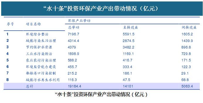 “水十條”帶來萬億投資需求,水環(huán)境治理風口呈現(xiàn)。根據(jù)環(huán)保部環(huán)境規(guī)劃院測算,依據(jù)投資單價和工程任務量兩個參數(shù)初步估算,完成“水十條”將投資4.6萬億,通過加大治污投資將帶動環(huán)保產(chǎn)業(yè)產(chǎn)出增長約1.9萬億元,其中直接購買環(huán)保產(chǎn)業(yè)產(chǎn)品和服務約1.4萬億元,間接帶動環(huán)保產(chǎn)業(yè)產(chǎn)出增加5063.4億元。隨著投融資、建設管理等模式創(chuàng)新,將持續(xù)提升相關環(huán)保產(chǎn)業(yè)發(fā)展水平,創(chuàng)造更大的經(jīng)濟社會效益。