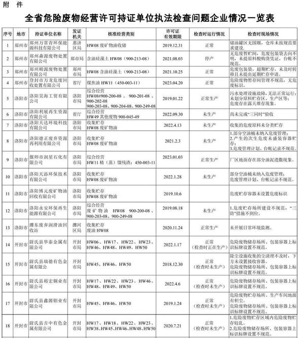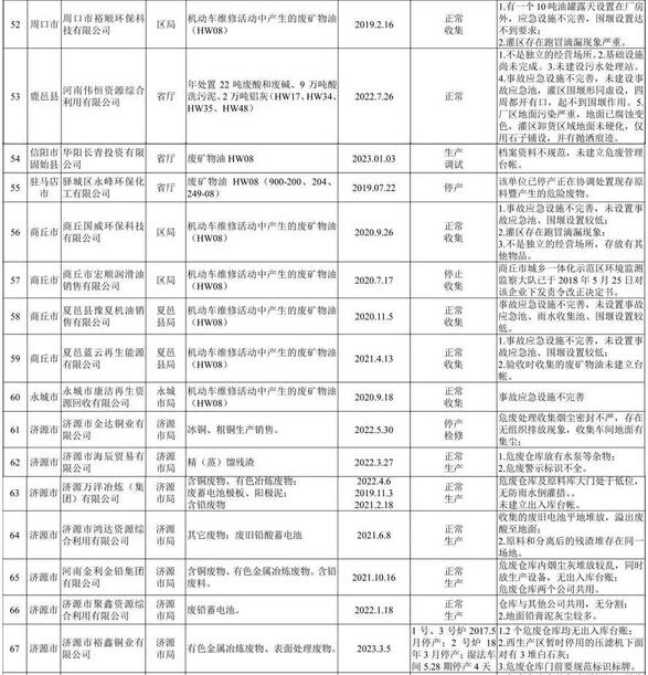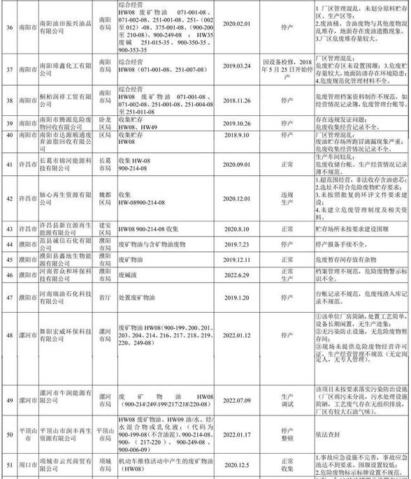 平頂山市潤(rùn)豐再生資源有限公司持有平頂山市環(huán)保局核發(fā)的危險(xiǎn)廢物經(jīng)營(yíng)許可證,經(jīng)營(yíng)范圍中不含"油泥"。但在該企業(yè)廠區(qū)卻發(fā)現(xiàn)堆存約100余噸從浙江、江蘇運(yùn)進(jìn)的油泥,此批危廢未履行跨省轉(zhuǎn)移手續(xù),目前,當(dāng)?shù)毓埠铜h(huán)保部門均已開(kāi)展偵查調(diào)查;許昌市軸心再生資源有限公司持有許昌市魏都區(qū)環(huán)保局頒發(fā)的廢礦物油收集經(jīng)營(yíng)許可證,現(xiàn)場(chǎng)檢查發(fā)現(xiàn)該公司廠房?jī)?nèi)放有"經(jīng)營(yíng)許可范圍"以外廢機(jī)油濾芯(屬于危險(xiǎn)廢物),涉嫌超范圍經(jīng)營(yíng);鞏義市綠洲廢物處置有限公司2016-2017年連續(xù)兩年超許可規(guī)模經(jīng)營(yíng)。