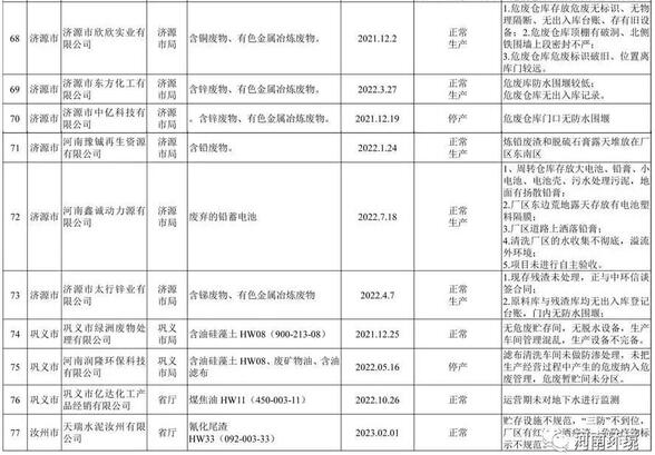 三門峽鑫華礦冶有限公司2015年運(yùn)營(yíng)期間移入26000噸含鉛玻璃,2016年企業(yè)破產(chǎn)重整停業(yè),但至今庫(kù)存3600多噸含鉛玻璃仍未處置;新鄉(xiāng)市亞洲金屬循環(huán)利用有限公司危廢倉(cāng)庫(kù)內(nèi)存放1638.23噸還原爐渣(疑似危廢),從2013年開(kāi)始生產(chǎn)堆存至今未安全處置;濟(jì)源市太行鋅業(yè)有限公司堆存煉銻殘?jiān)?00多噸,去年至今未處置。