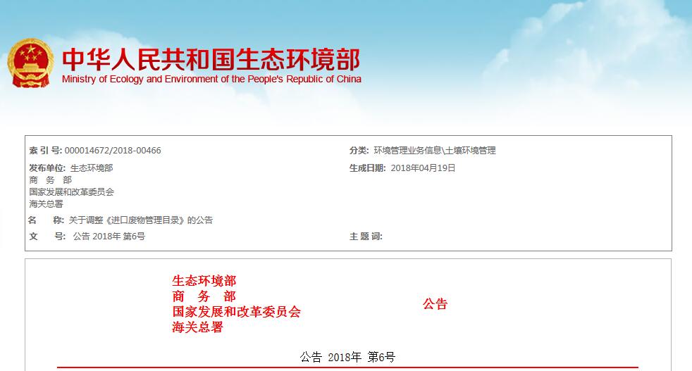 關(guān)于調(diào)整《進(jìn)口廢物管理目錄》的公告