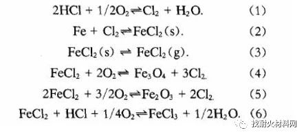 垃圾中塑料、橡膠和廚房廢料中都含有氯元素,例如聚氯乙烯廢物、聚偏二氯乙烯廢物、氯化丁基橡膠廢物、氯化鈉、氯化鉀等,這些有機和無機氯化物在高溫焚燒后都會產生HCl。垃圾焚燒廢氣中的氧的質量分數(shù)為5%?10%,而HCl的質量濃度為800?4000mg/m3。高溫HCl的腐蝕機理目前報道較多的是活化氧化的機理,可見以下化學反應式: