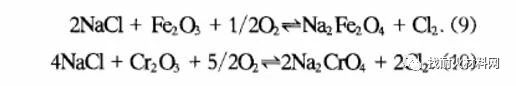 由反應式(7)生成的HCl可以進一步氧化成Cl2,從而進一步腐蝕金屬,具體過程與HCl高溫腐蝕相似。高溫熔融的堿金屬氯化物亦可以與金屬氧化物反應,具體可見以下化學反應式: