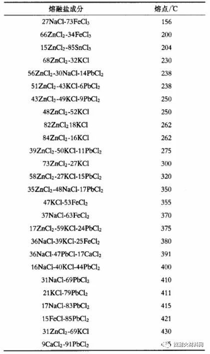 在破壞金屬氧化膜的同時,還釋放出Cl2,進一步發(fā)生氣相腐蝕金屬。此外,熔融鹽含有多種混合氯化物,比如堿金屬和重金屬氯化物共混時,它們的共熔點變低,高溫環(huán)境下,熔融鹽成液相,這種液相腐蝕反應使熔融鹽腐蝕進一步加快,因為液相化學反應往往比固相反應快,其次,液相下會產生電解質發(fā)生電化學腐蝕。表1列出了部分混合熔融鹽的共熔點。