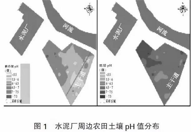 統(tǒng)計(jì)分析結(jié)果表明,上層土壤(0~20cm)pH 值在5.3~7.7 之間波動(dòng),均值為6.50,下層土壤(20~40 cm)pH 值在6.14~7.65 之間波動(dòng),均值為6.81。整體情況看,上層土壤pH 值整體低于下層,表層土壤變幅在1~2 個(gè)單位,下層土壤降幅為0.3 個(gè)單位左右??臻g變異結(jié)果表明(見圖1),水泥廠附近的農(nóng)田土壤pH 值整體在7 左右,距離水泥廠越遠(yuǎn)農(nóng)田土壤pH 值越低,但該區(qū)域靠近公路,公路對(duì)該區(qū)域農(nóng)田土壤pH 值降低影響較大,而且隨著影響時(shí)間的延長,底層土壤也受到了影響。