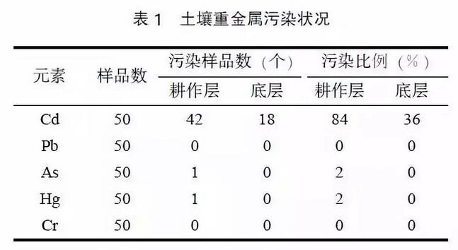 為研究污染場(chǎng)地對(duì)周邊農(nóng)田土壤重金屬的影響程度,選取國家GB 15618-1995 《土壤環(huán)境質(zhì)量標(biāo)準(zhǔn)》中的2 級(jí)標(biāo)準(zhǔn)作為閾值。采用單因子指數(shù)法對(duì)水泥廠周邊農(nóng)田表層土壤總體環(huán)境質(zhì)量現(xiàn)狀進(jìn)行評(píng)價(jià),結(jié)果如表1 所示。水泥廠周邊農(nóng)田土壤Pb和Cr 沒有呈現(xiàn)污染特征,但土壤As 和Hg 已呈輕度污染,分別有1 個(gè)樣點(diǎn)質(zhì)量分?jǐn)?shù)超標(biāo),超標(biāo)率為2%;而土壤Cd的污染已較為嚴(yán)重,超標(biāo)樣點(diǎn)數(shù)達(dá)42 個(gè),超標(biāo)率高達(dá)84%。同時(shí)又采用內(nèi)梅羅污染指數(shù)法進(jìn)行綜合評(píng)價(jià),以綜合指數(shù)大于1 為臨界值。結(jié)果表明,石灰廠周邊農(nóng)田耕作層土壤共有33 個(gè)樣點(diǎn)超標(biāo),超標(biāo)率達(dá)66%,最大值達(dá)到1.90;底層土壤共有6 個(gè)樣點(diǎn)超標(biāo),超標(biāo)率達(dá)12%,最大值達(dá)到1.72。根據(jù)《農(nóng)田土壤環(huán)境質(zhì)量監(jiān)測(cè)技術(shù)規(guī)范》土壤污染分級(jí)標(biāo)準(zhǔn),該區(qū)域?yàn)檩p度污染等級(jí)。