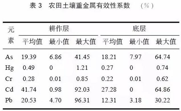 分析土壤重金屬有效性系數(shù)(有效態(tài)含量占全量百分比)(見表3),得出耕作層土壤中5 種重金屬的有效性系數(shù)平均值都大于底層,也表明耕作層Pb、Cd、Cr、As、Hg 受外源污染風(fēng)險(xiǎn)較大。而且由于大氣酸沉降等原因造成的表層土壤酸化,也是導(dǎo)致重金屬活性升高的原因之一。