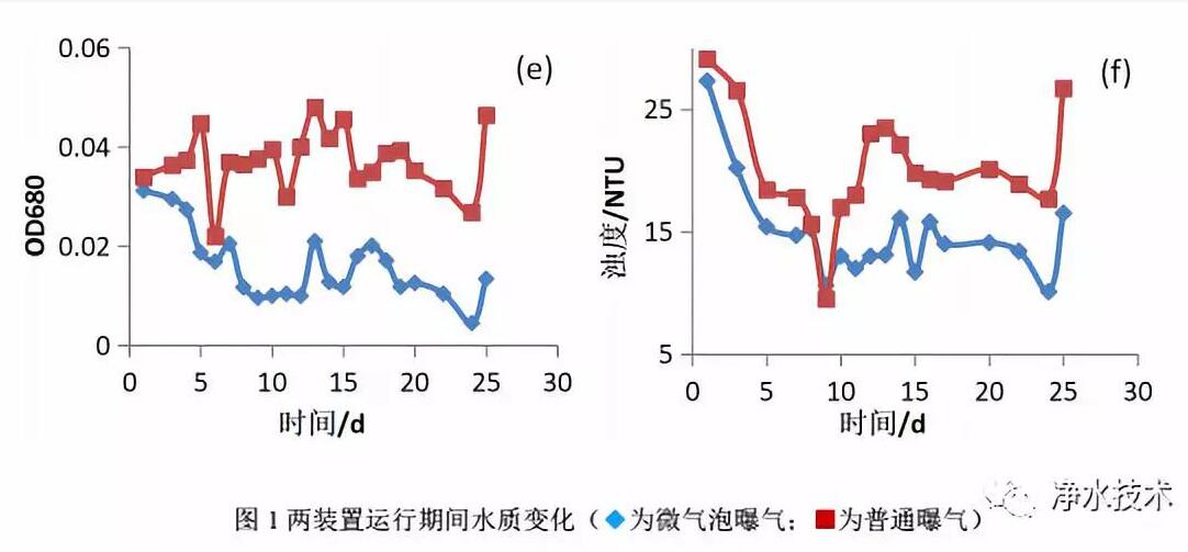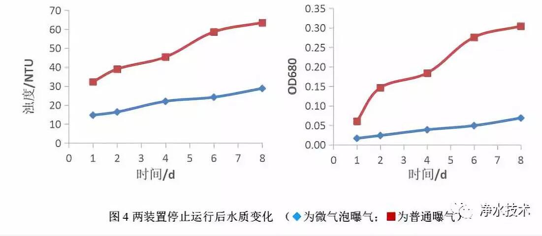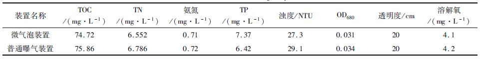 (2)在結(jié)束曝氣處理后,雖然水中仍有營(yíng)養(yǎng)物質(zhì)存在,但微氣泡系統(tǒng)內(nèi)水質(zhì)可以保持一段時(shí)間,而普通曝氣系統(tǒng)內(nèi)水質(zhì)會(huì)迅速惡化。