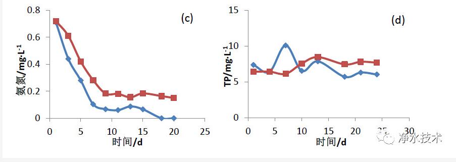 整個(gè)試驗(yàn)期間,微氣泡曝氣系統(tǒng)的TOC濃度始終低于普通曝氣系統(tǒng),如圖1(a)所示。初始運(yùn)行的5d內(nèi),曝氣提高了水中溶解氧,微生物大量繁殖,使得兩裝置內(nèi)水中的TOC濃度均經(jīng)歷了一個(gè)快速下降的過(guò)程。之后,TOC濃度持續(xù)緩慢下降,試驗(yàn)?zāi)┢谖馀萜貧庀到y(tǒng)的TOC為18.2mg/L,下降了76%。氨氮濃度的變化趨勢(shì)[圖1(c)]與TOC類似,微氣泡曝氣水體內(nèi)氨氮濃度下降更為迅速,在18d時(shí),微氣泡曝氣水體的氨氮濃度已經(jīng)降為0,而普通曝氣水體的氨氮濃度在第9d之后不再變化。試驗(yàn)?zāi)┢?,微氣泡曝氣水體內(nèi)TN和TP濃度均低于普通曝氣水體,如圖1(b)和1(d)所示。另外,試驗(yàn)中觀察到水中的TN和TP較高,且變化不大,可能是與試驗(yàn)所取河道底泥上方水體為生活污水,含有大量的氮磷元素,可形成不易被降解的膠體有關(guān)。