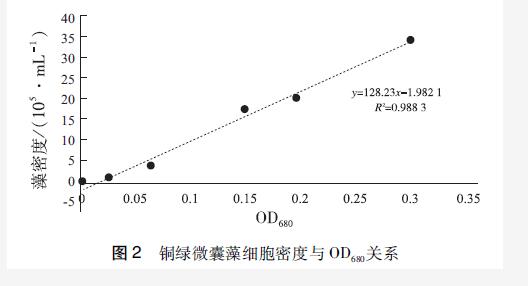 在黑臭水體的修復(fù)過(guò)程中關(guān)注的重要水質(zhì)指標(biāo)是其表觀指標(biāo),本試驗(yàn)中體現(xiàn)為OD680、濁度和透明度三個(gè)指標(biāo)。OD680為含藻液在680nm波長(zhǎng)處的吸光值,可以間接反映藻細(xì)胞的數(shù)量。對(duì)試驗(yàn)采用的水體進(jìn)行鏡檢發(fā)現(xiàn),銅綠微囊藻是一種優(yōu)勢(shì)藻種,因此,用顯微鏡計(jì)數(shù)表示的藻細(xì)胞濃度與藻液在680nm處的吸光值進(jìn)行對(duì)比,發(fā)現(xiàn)二者之間呈良好的線性關(guān)系(圖2)。