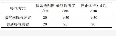 運(yùn)行期結(jié)束后,持續(xù)監(jiān)測(cè)了8d兩裝置內(nèi)的水質(zhì)變化情況(OD680、濁度和透明度),OD680和濁度數(shù)據(jù)如圖4所示,透明度數(shù)據(jù)列于表2。在停止曝氣后,由于沒有了曝氣引起的水面攪動(dòng)和持續(xù)通入的溶解氧,普通曝氣裝置內(nèi)水中藻類迅速繁殖,形成水華,OD680和濁度大幅上升,水質(zhì)迅速劣化;而微氣泡曝氣裝置內(nèi)水中藻類繁殖速度非常緩慢,僅在水面四周貼近水槽的部位發(fā)現(xiàn)了少量的藻類,并在上層水中觀察到肉眼可見的浮游動(dòng)物成群出現(xiàn)。研究表明,浮游生物對(duì)藻類繁殖有控制作用,這可能是停止微氣泡曝氣后,藻密度OD680增長(zhǎng)緩慢的因素之一,但是微氣泡曝氣促進(jìn)浮游生物大量繁殖的原因尚需進(jìn)一步研究。