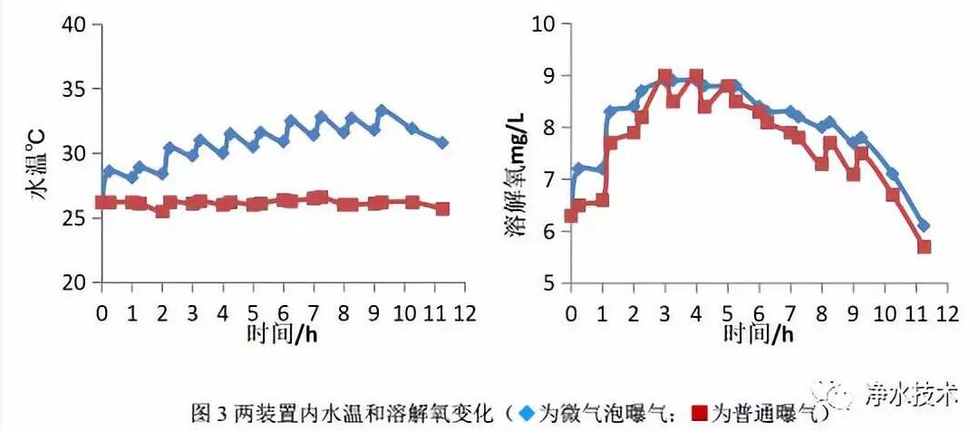 雖然水溫越高越不利于氣體溶解,但是微氣泡裝置內(nèi)的溶解氧濃度始終高于普通曝氣裝置,且在曝氣停止后波動(dòng)很小,而普通曝氣裝置內(nèi)的溶解氧濃度在15min的曝氣停止后下降較為明顯??紤]到微氣泡曝氣本身的曝氣量只有普通曝氣的十分之一,由此可以推測(cè),在實(shí)際黑臭河道水體的曝氣中如果采用微氣泡曝氣方式可以大大減少曝氣量。