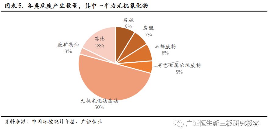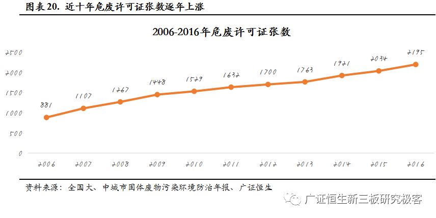 一是環(huán)保統(tǒng)計口徑的變化,可以看到,危廢產(chǎn)生量在2011年和2016兩次快速增長,2011年的增長是因為統(tǒng)計量從10kg下降到了1kg,2016年是擴大了危廢的種類,從400種擴大到了479種。