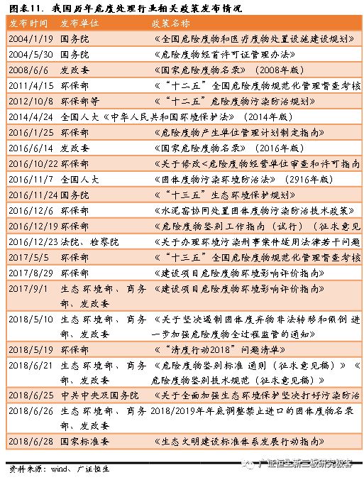 一是環(huán)保執(zhí)法力度加嚴。立法層面:根據(jù)2016年12月“兩高”出臺的關(guān)于《關(guān)于辦理環(huán)境污染刑事案件適用法律若干問題的解釋》,涉及入刑的條款,在認定為“嚴重污染環(huán)境”的18個行為中,9條與危廢直接相關(guān)。執(zhí)法層面:2016年開始的中央環(huán)保督查,處理環(huán)保案件近十萬起,立案處罰2.69萬起,問責1.7萬人,罰款12.64億元。2018年長江經(jīng)濟帶開始的“清廢2018”行動,有望在2019-2020年推廣至全國。