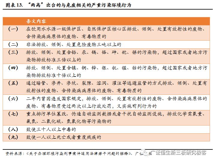 根據(jù)2016年12月,“兩高”出臺的關(guān)于《關(guān)于辦理環(huán)境污染刑事案件適用法律若干問題的解釋》,涉及入刑的條款,大部分與危廢直接相關(guān),在認定為“嚴重污染環(huán)境”的18個行為中,9條與危廢直接相關(guān)。