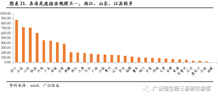 從核準規(guī)模來看,危廢核準規(guī)模為6471萬噸,其中資源化占比在70%以上,近幾年增速變慢,從各省來看,危廢的產(chǎn)生量與核準量基本匹配,核準數(shù)量較多的是浙江、山東及江蘇。