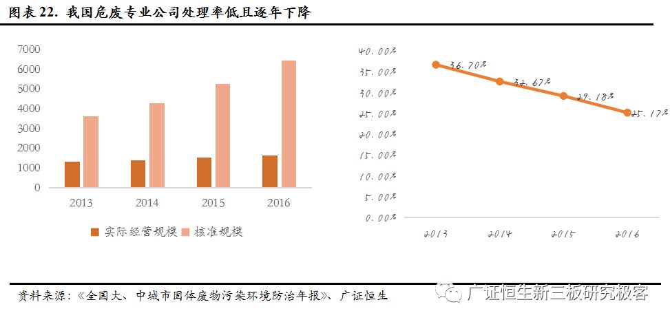 雖然核準產(chǎn)能足以覆蓋環(huán)保部披露的危廢統(tǒng)計量,但是與推測的數(shù)據(jù)相差較大,同時,危廢專業(yè)化公司的處理率低且持續(xù)下滑,2016年產(chǎn)能利用率僅25.17%。