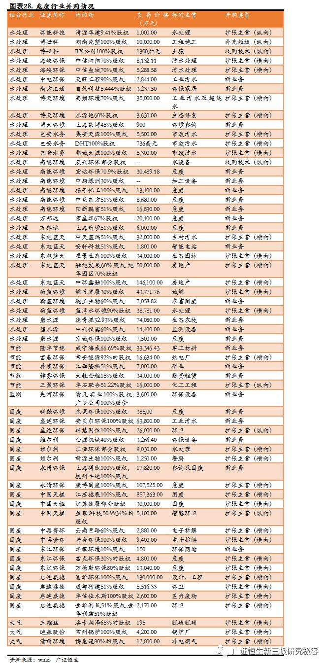進軍新業(yè)務的案例有24家,方向為危廢、工業(yè)環(huán)保以及環(huán)保設備,其中危廢高達9家,工業(yè)污水2家,設備4家,為并購的主要方向,這也與危廢跟工業(yè)環(huán)保有比較高的技術(shù)壁壘相關(guān)。