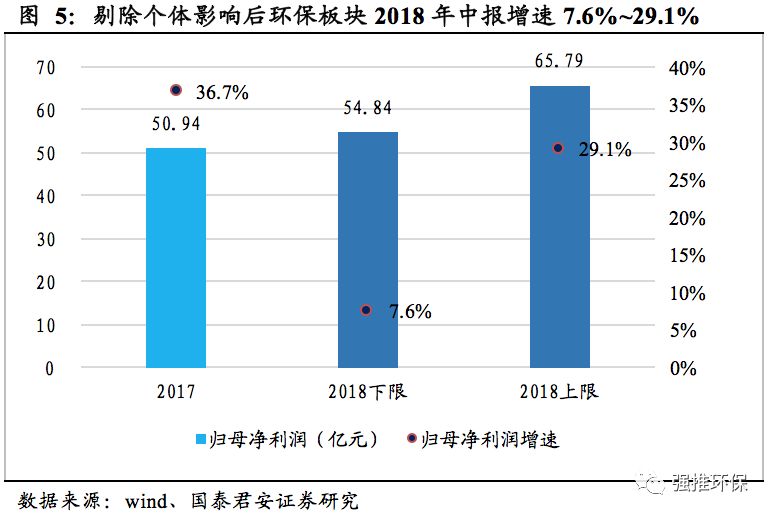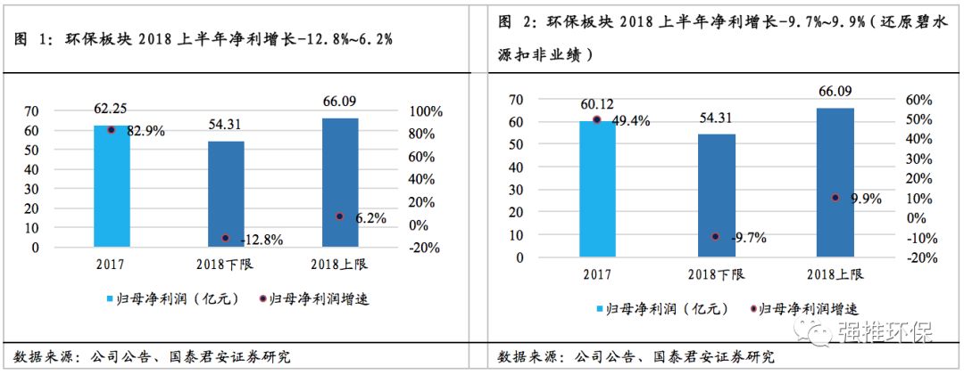 我們統(tǒng)計(jì)環(huán)保板塊2018年中報(bào)業(yè)績披露情況,截至2018年7月14日,板塊共有45家上市公司披露業(yè)績預(yù)告,其中36家為最新披露,其余9家為4月份年報(bào)時(shí)披露。根據(jù)業(yè)績預(yù)告的區(qū)間統(tǒng)計(jì),該45家上市公司的歸母凈利潤下限合計(jì)54.31億元、上限合計(jì)66.09億元,相對2017年同期的62.25億元,增速在-12.8%~6.2%之間??紤]到板塊龍頭公司碧水源上年同期公司較大的投資收益造成非經(jīng)常性損益,將碧水源的業(yè)績修正為扣非業(yè)績后,板塊增速在-9.7%~9.9%之間。相對于上年同期49.4%(剔除2016未披露中報(bào)的新股)的增速,下滑幅度較為明顯。