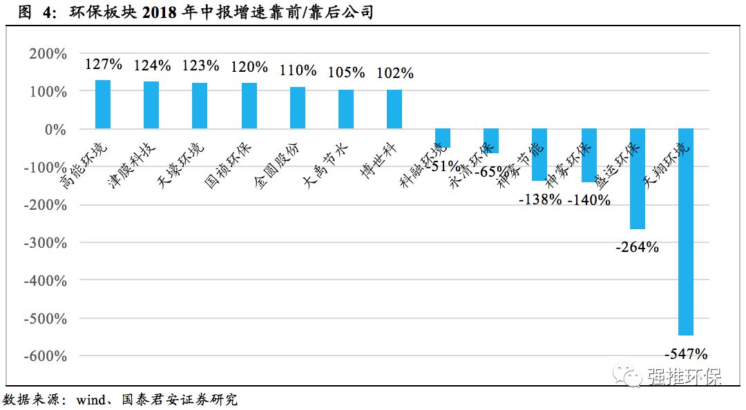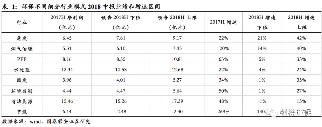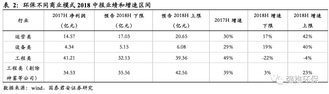 從細(xì)分子行業(yè)來看,危廢、煙氣治理、PPP、固廢、環(huán)境監(jiān)測、清潔能源、水處理、節(jié)能的增速區(qū)間分別為21%~42%、15%~40%、5%~33%、1%~33%、1%~27%、-1%~13%、-14%~3%、-140%~-137%??梢钥闯觯U板塊的增速下限已經(jīng)與2017年中報(bào)的增速持平,而以節(jié)能、清潔能源為主的細(xì)分板塊過去兩年帶領(lǐng)環(huán)保板塊增長的工程類模式增速出現(xiàn)了較大幅度的下滑,且PPP、水處理等細(xì)分板塊增速也有所放緩。