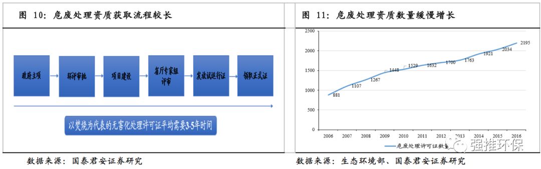 有進(jìn)入壁壘,有技術(shù)或管理優(yōu)勢。危廢處理行業(yè)管理采用許可證制度,沒有獲得許可證的企業(yè)不得進(jìn)行危廢處理。許可證的獲取需要經(jīng)過政府立項(xiàng)、環(huán)評審批、項(xiàng)目建設(shè)、省廳專家組評審、發(fā)放試生產(chǎn)證、領(lǐng)取正式證,以焚燒為代表的無害化處理許可證平均需要3~5時(shí)間。根據(jù)環(huán)保部2017年12月發(fā)布的《2017年全國大、中城市固體廢物污染環(huán)境防治年報(bào)》數(shù)據(jù),截至2016年底,全國共頒發(fā)危險(xiǎn)廢物經(jīng)營許可證2195份,較2015年增加131份,增速6%,資質(zhì)增速緩慢。