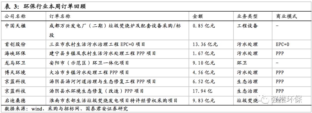 本周板塊訂單回顧:本周環(huán)保公司中新增訂單8單,金額合計(jì)63.83億元,其中首創(chuàng)股份(13.36)、京藍(lán)科技(17.94)在10億以上。