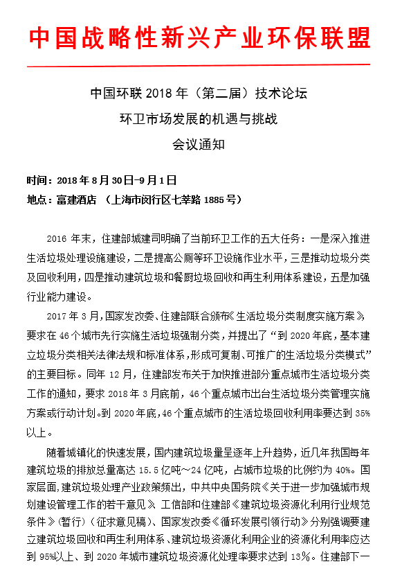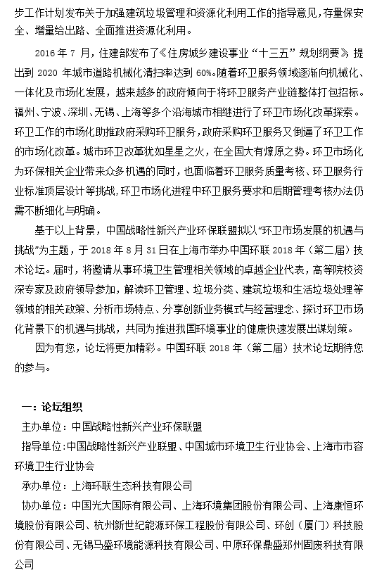 中國環(huán)聯(lián)2018年(第二屆)技術(shù)論壇 環(huán)衛(wèi)市場發(fā)展的機(jī)遇與挑戰(zhàn)