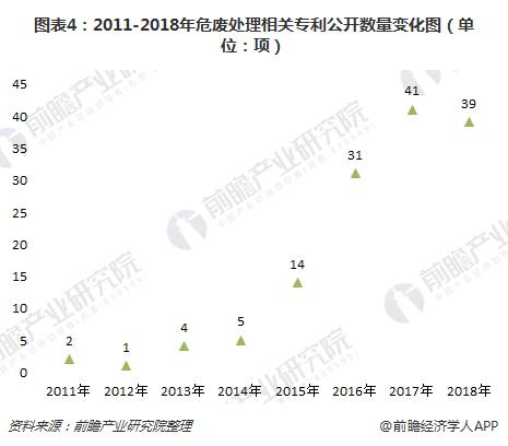 在公開(kāi)專(zhuān)利數(shù)量方面,2011-2017年,我國(guó)危廢處理專(zhuān)利公開(kāi)數(shù)量總體上呈趨勢(shì)。2017年,我國(guó)危廢處理專(zhuān)利公開(kāi)數(shù)量為41項(xiàng),達(dá)到近年來(lái)最大值;截至2018年7月,專(zhuān)利公開(kāi)數(shù)量為39項(xiàng)。