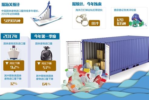 在加強(qiáng)監(jiān)管的同時(shí),海關(guān)等部門(mén)還加大了對(duì)“洋垃圾”走私的正面攔截。今年5月22日,全國(guó)海關(guān)開(kāi)展了打擊“洋垃圾”走私“藍(lán)天2018”專項(xiàng)第三輪集中行動(dòng),這是近年來(lái)海關(guān)開(kāi)展的最大規(guī)模打擊“洋垃圾”走私集中行動(dòng)。據(jù)統(tǒng)計(jì),今年以來(lái),海關(guān)已打掉走私犯罪團(tuán)伙81個(gè),查獲查證各類“洋垃圾”120多萬(wàn)噸。
