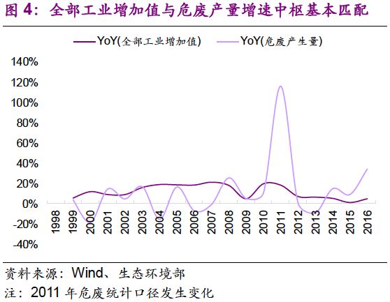 2011年統(tǒng)計口徑發(fā)生變化,當年危廢產(chǎn)生量提升較快。當年,我國改革危廢統(tǒng)計規(guī)則,將下限由10 kg降至1 kg,同年各個行業(yè)的危廢統(tǒng)計量均具有一定數(shù)量的增加。