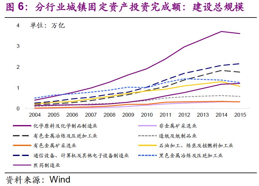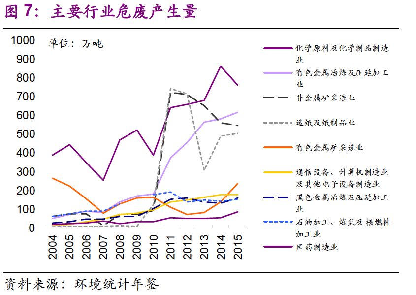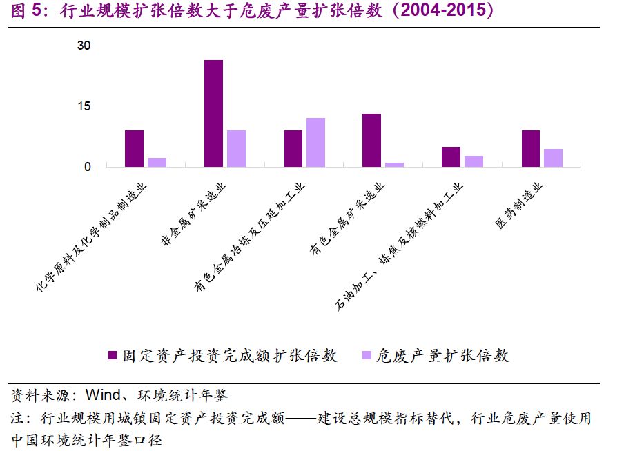 我們也關(guān)注到主要行業(yè)規(guī)模擴張倍數(shù)大于危廢產(chǎn)量擴張倍數(shù)。從2004年到2015年,化學原料及化學制品制造業(yè)、非金屬礦采選業(yè)、有色金屬冶煉及壓延加工業(yè)、有色金屬礦采選業(yè)、石油加工、煉焦及核燃料加工業(yè)、醫(yī)藥制造業(yè)的城鎮(zhèn)固定資產(chǎn)投資完成額——建設總規(guī)模分別是2004年的9 、26 、9 、13 、5 、9 倍,我國工業(yè)體系得到長足發(fā)展。同期,各行業(yè)危廢產(chǎn)量分別是原來的2 、9 、12、1、3 、4 倍,總體小于建設總規(guī)模擴張倍數(shù)。