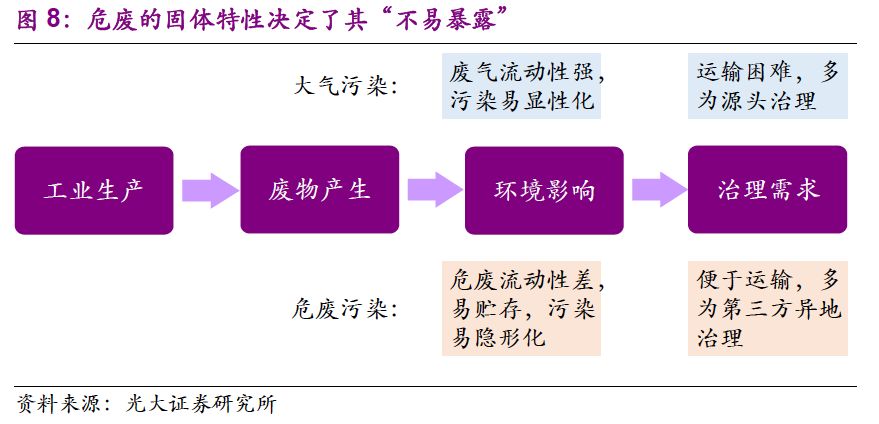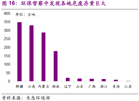 危廢的固體性質(zhì)決定了隱性需求釋放依賴環(huán)保執(zhí)法壓力。按照污染物性質(zhì),可分為廢氣、廢水、固廢三類。就環(huán)境影響來講,廢氣流動性強,污染顯性化,也是最早引起關(guān)注的。危廢多為固體,易于貯存和隱匿,污染呈隱性化。過去環(huán)保執(zhí)法壓力不足,大量危廢被就地掩埋或違規(guī)傾倒,造成了嚴重的環(huán)境影響。相比大氣治理,危廢污染的總量難以掌握,加上其治理費用高昂,治理需求,尤其是存量的釋放較大程度上依賴環(huán)保執(zhí)法壓力。