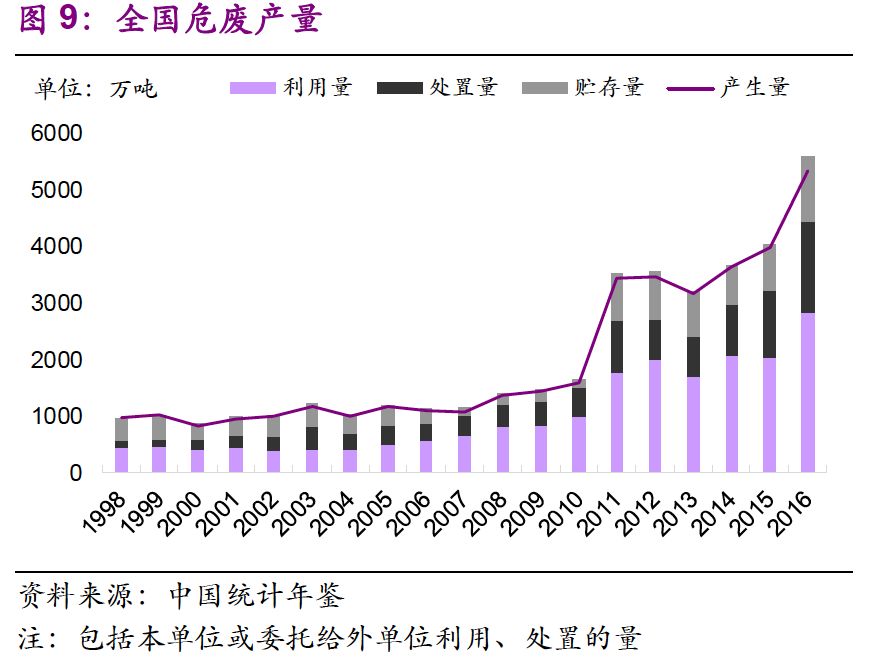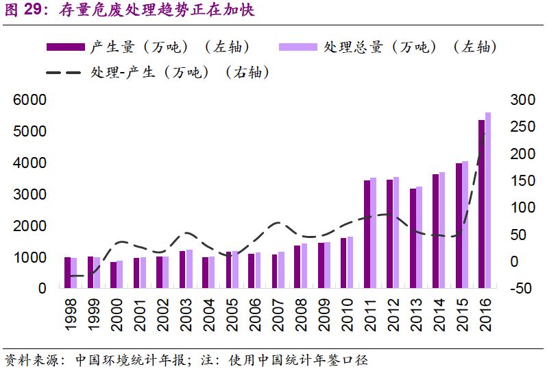 1. 存量危廢處理趨勢正在加快。2016年,以處理總量減去當年產(chǎn)生量計算處置往年貯存量,得出處置往年貯存量超過240萬噸,是2015年的4倍。由于環(huán)保壓力加強,大量超期貯存危廢得到處置。同時環(huán)保督察中許多歷史遺留暴露,導致處置量大于產(chǎn)生量,存量消滅趨勢明顯。作為“歷史欠賬”,存量危廢入市是必然趨勢。然而考慮到危廢種類,占存量絕大多數(shù)的危廢并不會直接流向危廢處置企業(yè)。參考存量鉻渣的處理,未來很有可能以專項整治的方式進行解決。