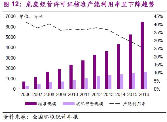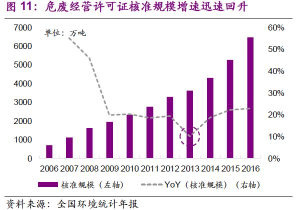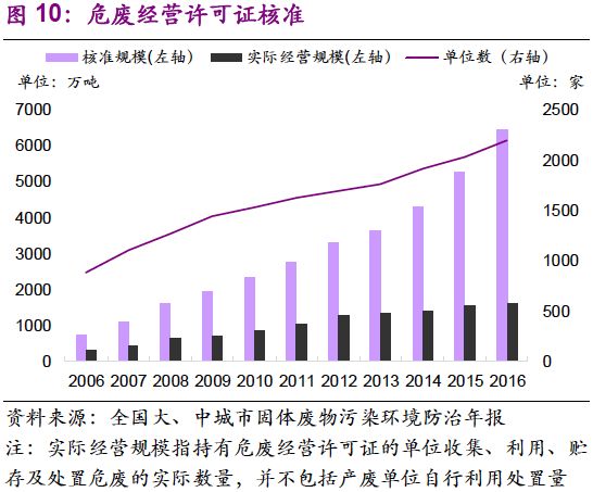 危廢經(jīng)營許可規(guī)模的增加速度與需求釋放速度相當。值得注意的是,2013-2016年,全國危廢產(chǎn)量年均復合增速19%,危廢許可經(jīng)營規(guī)模年均復合增速21%。截止2016年底,總核準發(fā)放規(guī)模已達到6471萬噸。