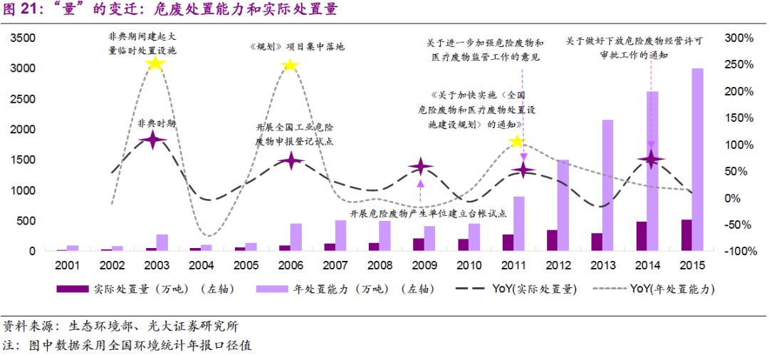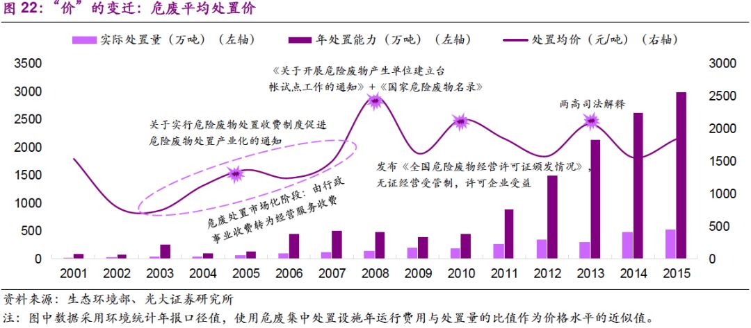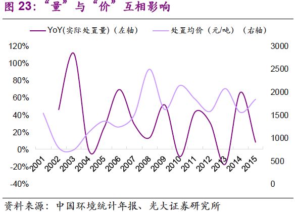 量:處置量提高的驅(qū)動因素已經(jīng)由工業(yè)發(fā)展轉(zhuǎn)變?yōu)榄h(huán)保執(zhí)法。我們認為,2001-2008年,實際處置量迅速增長的驅(qū)動力在于國內(nèi)工業(yè)迅速發(fā)展帶動的自然需求,以及“危廢申報制度”、“企業(yè)臺帳制度”等基本制度建立下的規(guī)范化作用;而2011年至今,在工業(yè)體系逐漸成熟的背景下,實際處置量增長的主要驅(qū)動力來自環(huán)保執(zhí)法的強化。