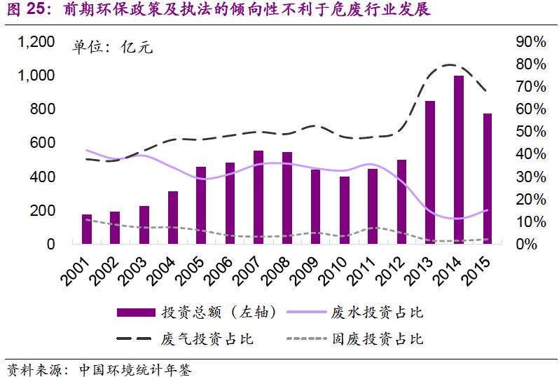(1)前期環(huán)保政策及執(zhí)法的傾向性不利于危廢行業(yè)發(fā)展。污染的負外部性決定了環(huán)保行業(yè)規(guī)模主要受需求影響,而需求的釋放來自于政策所指向的環(huán)保壓力。2010年以后,我國的大氣污染是突出的環(huán)境問題,環(huán)保政策和執(zhí)法在一段時間內(nèi)更傾向于此,且采取突擊式的措施進行治理;而對其他類型的環(huán)境治理并未采取過于急迫的措施,環(huán)保壓力不足導致危廢處置行業(yè)發(fā)展緩慢和隱性排污情況較為普遍。在投資方面, 2014年,在工業(yè)污染源治理投資中,廢氣和固廢領域占比分別為79.1%和1.5%,工業(yè)固廢投資比例一直較低。