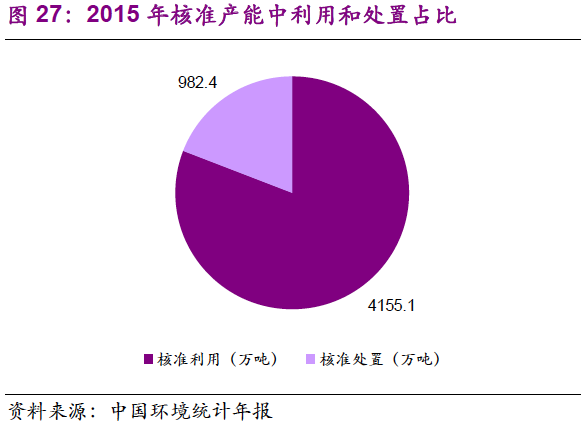 2015年,國家開始推行“三去、一降、一補”,主要行業(yè)固定資產(chǎn)總規(guī)模呈現(xiàn)下降趨勢,這也是供給側(cè)改革背景下的必然趨勢,而這種趨勢預計至少會延續(xù)到2020年。危廢的產(chǎn)生又與行業(yè)規(guī)模及工業(yè)產(chǎn)品產(chǎn)量有關(guān),因此我們有理由推斷,如果暫不考慮“存量”即隱性需求釋放和統(tǒng)計缺陷,危廢“增量”的實際增速是有限的。