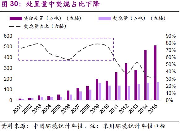 3.處置量中焚燒占比下降,其波動中樞由2001-2010年的70%降至2011-2015年的40%。原因在于危廢行業(yè)市場化運作加強,處置方式呈多元化發(fā)展。自2004年發(fā)改委《關(guān)于實行危險廢物處置收費制度促進危險廢物處置產(chǎn)業(yè)化的通知》出臺,危廢行業(yè)市場化趨勢明顯。相比傳統(tǒng)的焚燒、填埋,物化、水泥窯協(xié)同等手段逐漸拓展市場空間?!吨袊h(huán)境統(tǒng)計年報》顯示,2012年后,焚燒+填埋所處置的危廢量占比逐年下降,2015年已降至50%。另一方面,當前以焚燒為代表的無害化產(chǎn)能稀缺,我們認為短期內(nèi)“補短板”效應為主要因素。從長期來看,隨著循環(huán)經(jīng)濟的不斷推動,處置會趨于精細化,各種處置方式將均衡發(fā)展。
