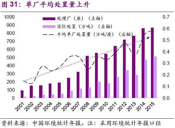 2. 單廠處置量上升,平均規(guī)模由2001年的0.15萬噸/座提升至2015年的0.6萬噸/座。開始階段,危廢處置小型企業(yè)居多,處理方式粗獷、簡單。隨著標準趨嚴,設備和技術(shù)的提高,單廠處置量大的企業(yè)具備規(guī)模效應。當前,危廢行業(yè)景氣度的提高,已引起資本市場關(guān)注,如雅居樂、東方園林、中信產(chǎn)業(yè)基金等跨界者強勢進入,并通過行業(yè)兼并等方式逐漸規(guī)?;?/p>