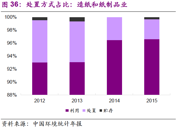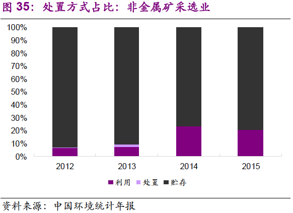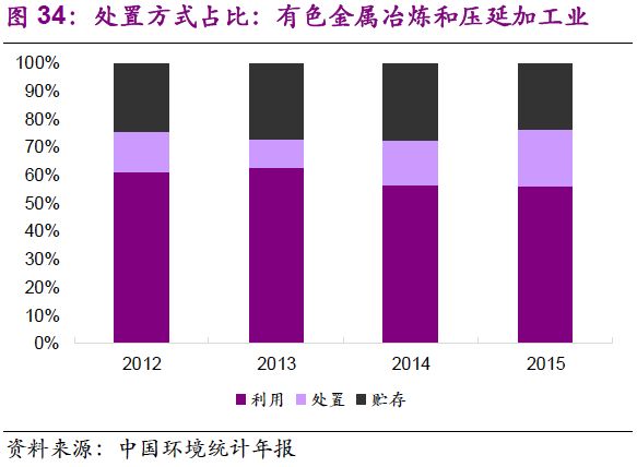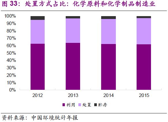 5. 在主要產(chǎn)廢行業(yè)中,危廢的利用和處置占比變化不大。化學原料和化學制品制造業(yè):2012-2015年,行業(yè)危廢綜合利用率在62%~64%之間窄幅振動,處置率為32%~35%;有色金屬冶煉和壓延加工業(yè):2012-2015年,行業(yè)危廢綜合利用率在56%~63%之間窄幅振動,處置率為11%~20%;非金屬礦采選業(yè):2012-2015年,行業(yè)危廢貯存率小幅下降,由2012年的93%降至2015年的79%,利用率由7%提升至21%,主要是石棉廢物的綜合利用取得進展。造紙和紙制品業(yè):行業(yè)危廢綜合利用率較高,且小幅上升,至2015年已達97%。