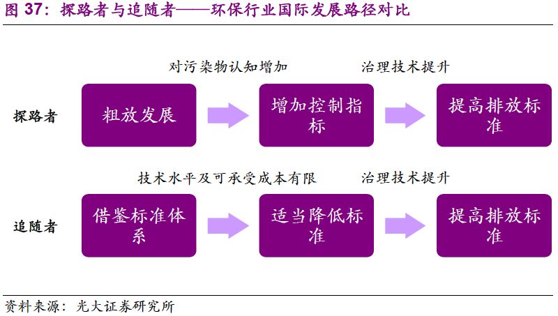 4. 基于國際比較,創(chuàng)新性地提出“探路者”與“追隨者”的角色區(qū)別,對兩者環(huán)保產(chǎn)業(yè)發(fā)展路徑做出對比。從發(fā)展階段的視角,對中國危廢產(chǎn)業(yè)進行定位,并用同樣的方法對水泥窯協(xié)同處置進行分析。