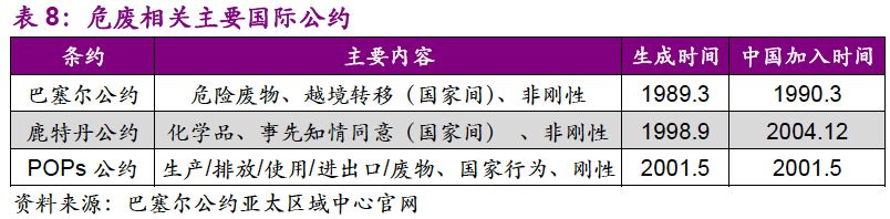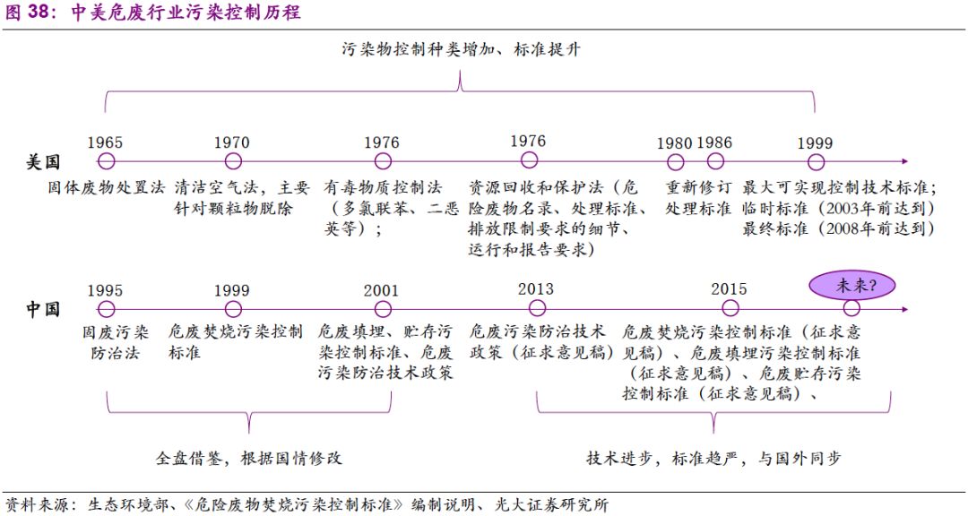 縱觀國際,我們認為中國危廢行業(yè)在技術(shù)和標準上屬于“追隨者”,具備“早熟”的特點。由于工業(yè)發(fā)展較快,發(fā)達國家的環(huán)保意識率先覺醒。隨著對污染物的認知提升,行業(yè)標準趨嚴,技術(shù)規(guī)范性逐漸提高。到了20世紀90年代,發(fā)達國家“探路者”的工作已基本完成。發(fā)展中國家雖與發(fā)達國家在工業(yè)及環(huán)保行業(yè)起步具有時間的滯后性,但在行業(yè)發(fā)展初期可以對整套標準及技術(shù)規(guī)范進行借鑒,從而具備“早熟”的特點。