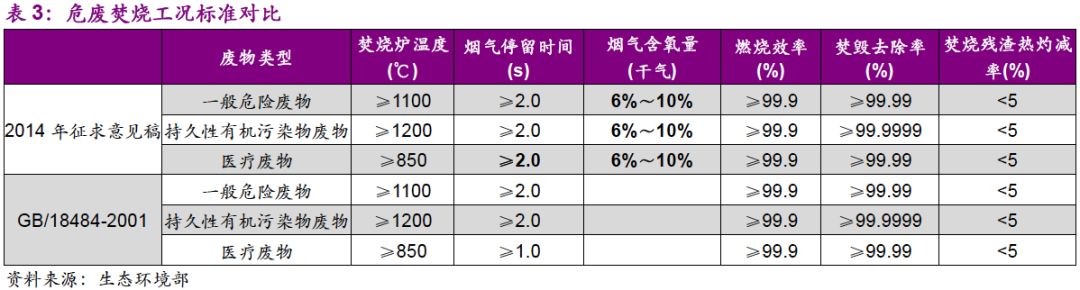 隨著對危廢焚燒條件掌握成熟,征求意見稿首先對危廢燃燒工況標準做了提高。相比GB/18484-2001,新增煙氣含氧量(干氣)指標,醫(yī)療廢物的煙氣停留時間限值由1 s改為2 s。