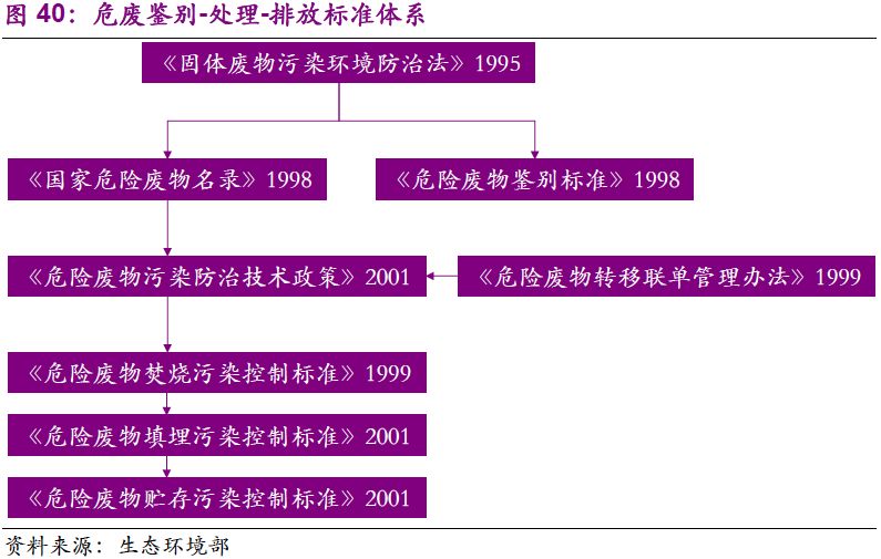 1995年《固廢法》的出臺,標志著我國危廢行業(yè)的起步?!豆腆w廢物污染環(huán)境防治法》首次從法律層面涉及危廢管理,同時提及經(jīng)營許可證、危險廢物轉(zhuǎn)移聯(lián)單、國家危險廢物名錄,而三者落地的時間分別為2004、1999和1998年。從1995-2002年,我國基本建立起危廢處理處置從鑒別-處理-排放的標準體系。