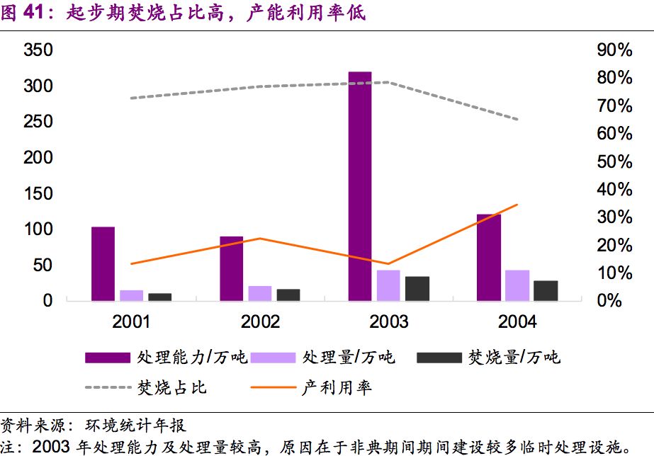 這一時期,焚燒占比維持在70%左右,產(chǎn)能利用率維持在20%左右。危廢處理以焚燒為主,我們認為原因有二:一是第一版《危險廢物名錄》中危廢種類尚未健全;二是資源化技術(shù)落后,大部分危廢只能通過焚燒處理。