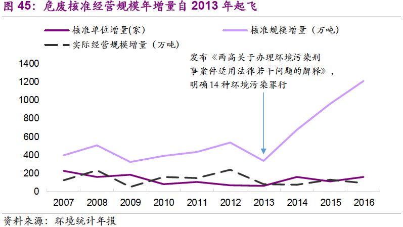 2013年,危廢入刑推動行業(yè)進入全新階段。2013年6月,最高人民法院、最高人民檢察院通過《關(guān)于辦理環(huán)境污染刑事案件適用法律若干問題的解釋》,規(guī)定非法排放、傾倒、處置危險廢物三噸以上的,應當認定為“嚴重污染環(huán)境”。危廢入刑直接推動危廢行業(yè)進入全新階段,年核準規(guī)模增量一躍而起,并逐年創(chuàng)新高。
